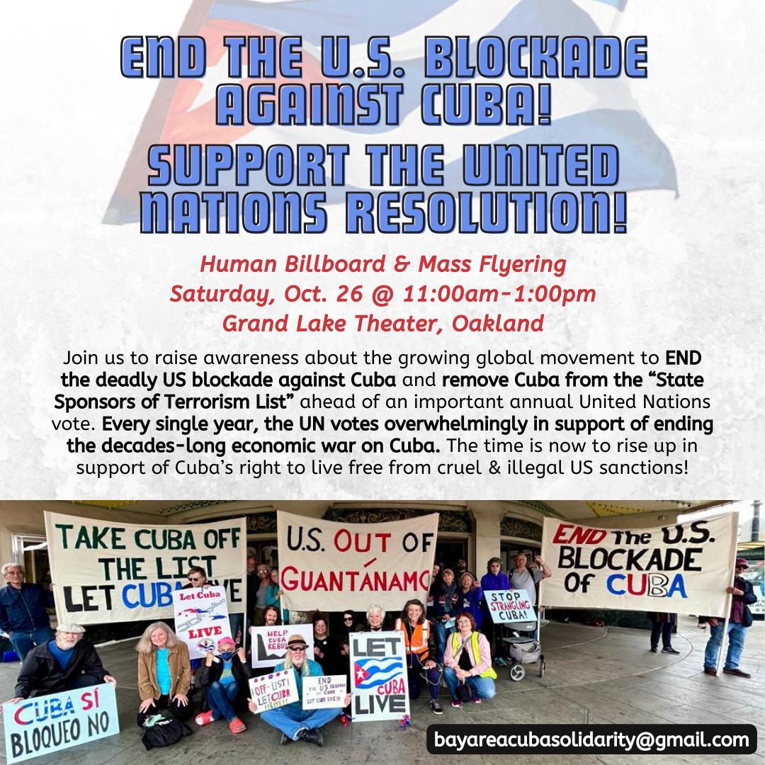 Join us to raise awareness about the growing global movement to END the deadly US blockade against Cuba. On October 29th and 30th, the UN General Assembly will be voting on a resolution condemning the commercial and financial blockade that the US imposes against Cuba. The General Assembly is expected to overwhelmingly condemn, for the 32nd year in a row, the illegal blockade which has put a stranglehold on the Cuban economy.