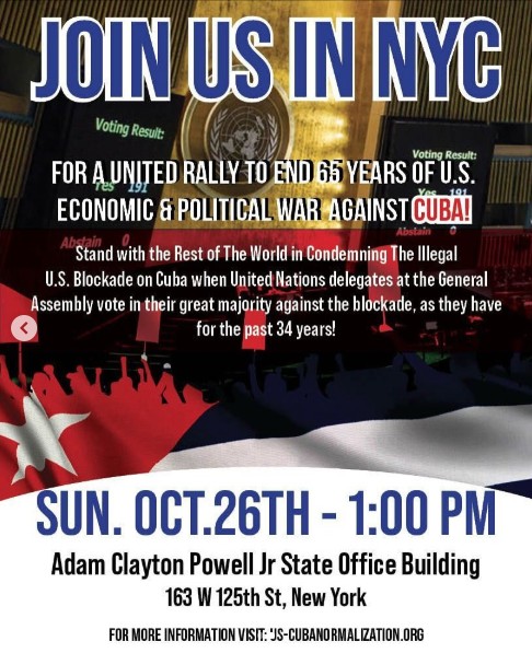 Stand with the Rest of the World in Condemning The Illegal U.S. Blockade on Cuba when United Nations delegates at the General Assembly vote in their great majority against the blockade, as they have for the past 34 years!