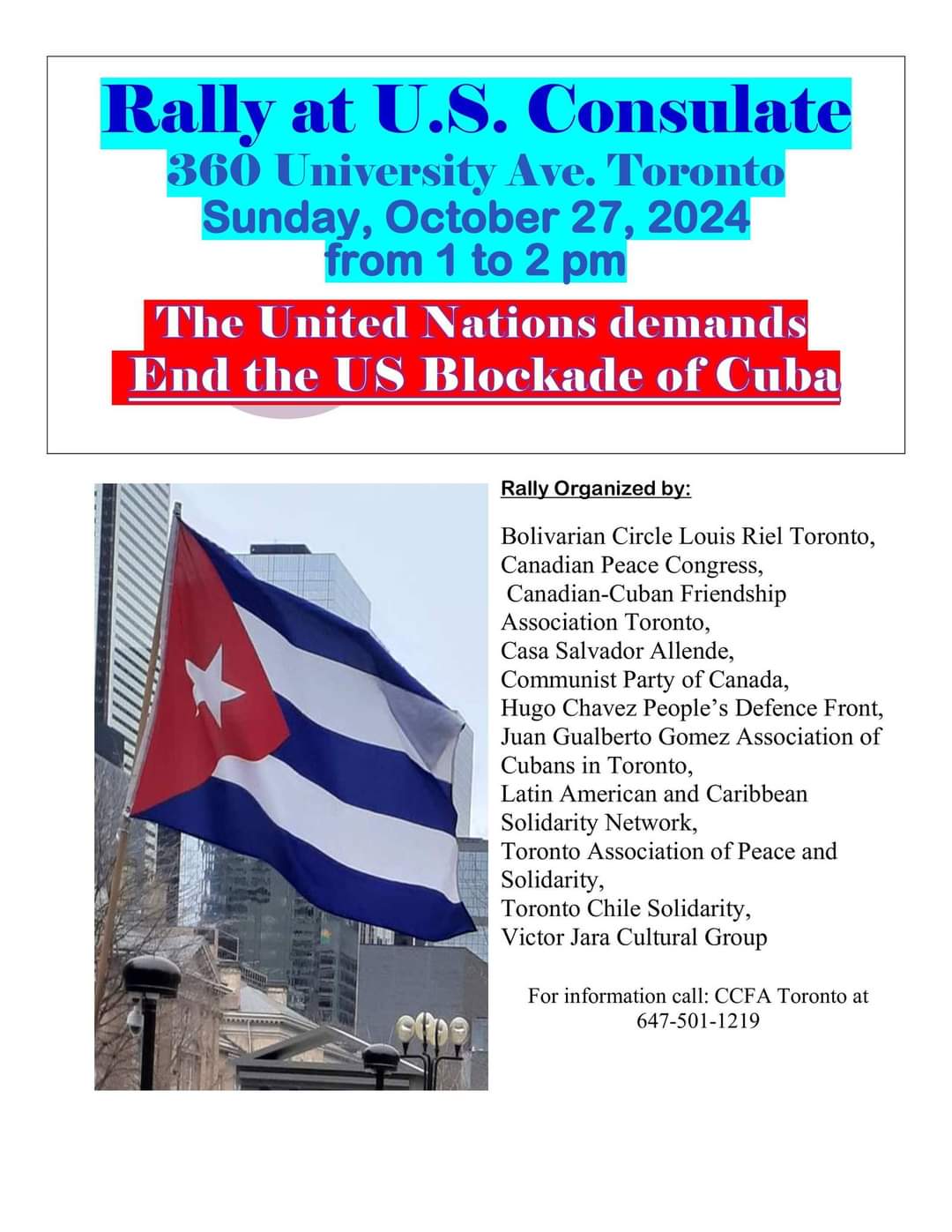 Rally Organized by: Bolivarian Circle Louis Riel Toronto, Canadian Peace Congress, Canadian-Cuban Friendship Association Toronto, Casa Salvador Allende, Communist Party of Canada, Hugo Chavez People's Defence Front, Juan Gualberto Gomez Association of Cubans in Toronto, Latin American and Caribbean Solidarity Network, Toronto Association of Peace and Solidarity. Toronto Chile Solidarity, Victor Jara Cultural Group