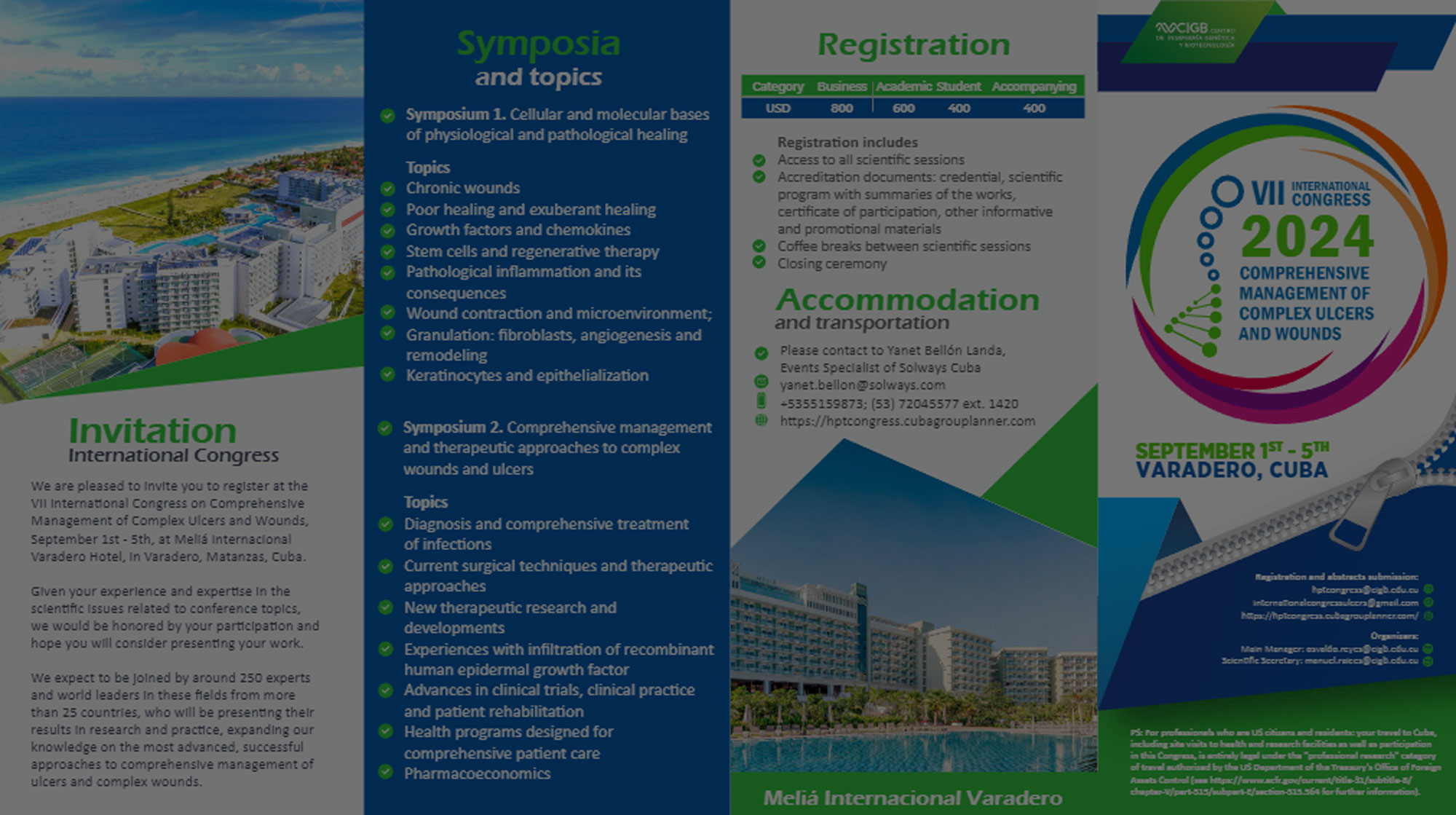 DOWNLOAD BROCHURE PDF FILE DOWNLOAD FLYER PDF FILE BROCHURE VII CONGRESS COMPLEX ULCERS AND WOUNDS-opt woundcongresscall070224 Post navigation Five joint initiatives with Cuba to improve health sectors