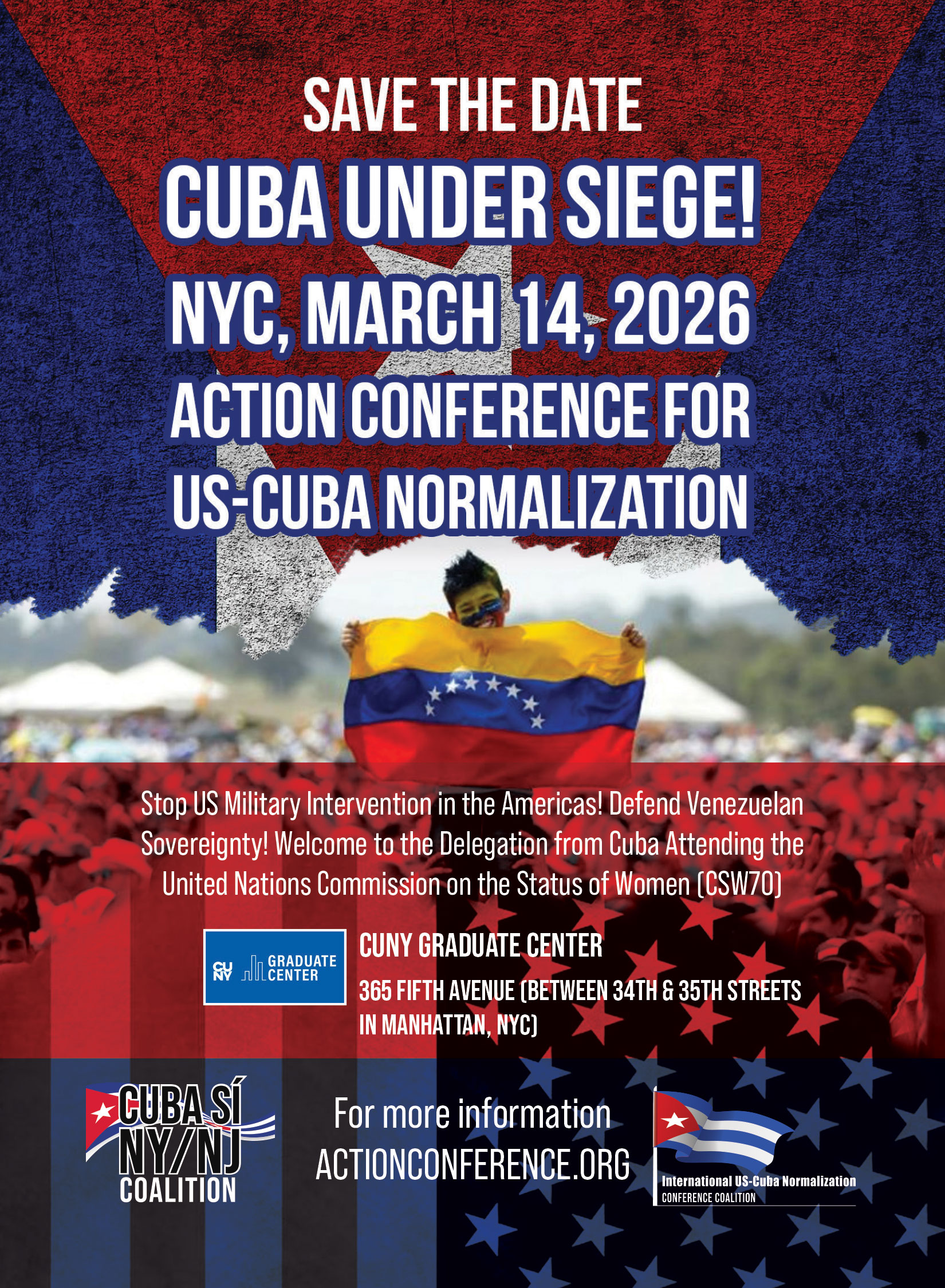 On March 14-15, 2026, a broad united front of organizations and activists is organizing an Action Conference for US-Cuba Normalization at the CUNY Graduate Center in New York City. The Action Conference will take place as a Federation of Cuban Women (FMC)-led delegation will be in NYC for the United Nations Commission on the Status of Women (CSW70) activities on March 9-20, 2026. Delegation members will be special guests and presenters at the Action Conference plenaries and panels/workshops, along with other prominent speakers and activists. The Action Conference will be live-streamed across the western hemisphere and internationally.