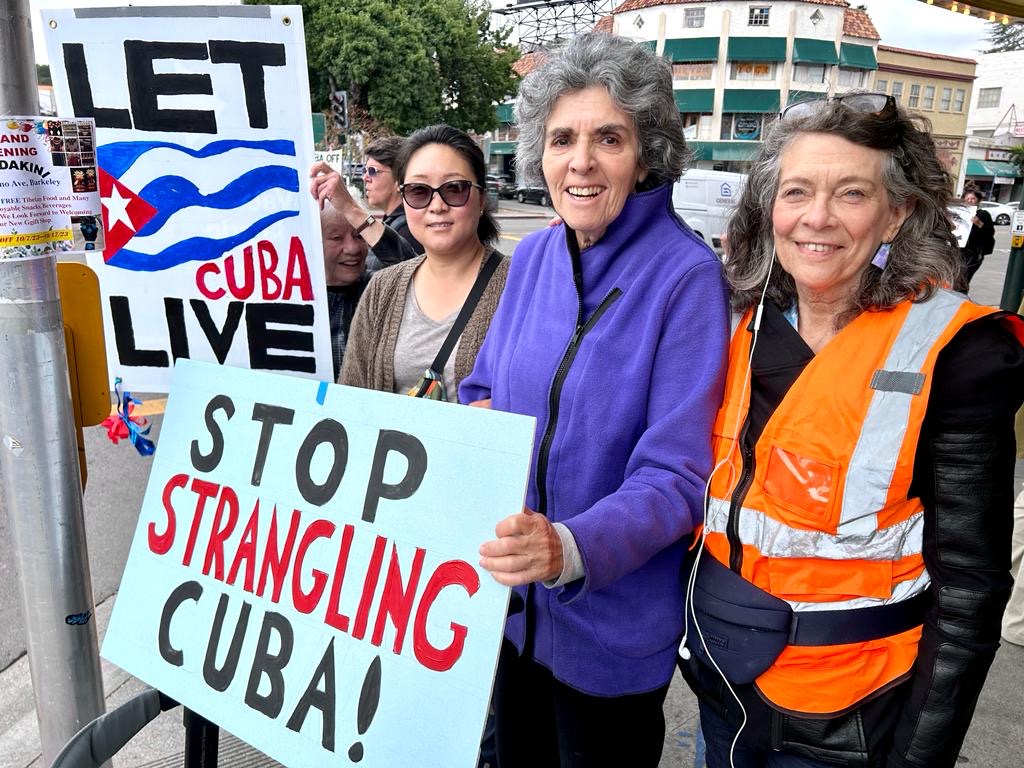 Over 30 Cuban Solidarity activists held signs and banners by the busy farmers market and in front of the iconic Grand Lake Theater in Oakland California today. Many cars honked as they went by and passer byes were receptive to the literature we passed out calling for Cuba being taken off the State Sponsor of Terrorism list, an end to the blockade and the closing of Guantanamo.