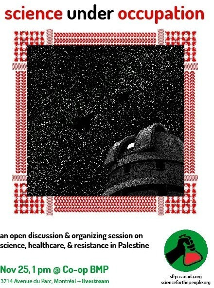 Science pour le peuple organise une discussion sur les nombreuses façons dont la science et les scientifiques sont liés à la lutte palestinienne. Qu’est-ce que c’est que de faire de la recherche clinique et fondamentale sous occupation? Quelle est la relation entre la recherche scientifique et le militarisme? Nous espérons que cet événement sera un lieu pour discuter des liens de la science avec l’occupation brutale en cours et la lutte pour la libération en Palestine.